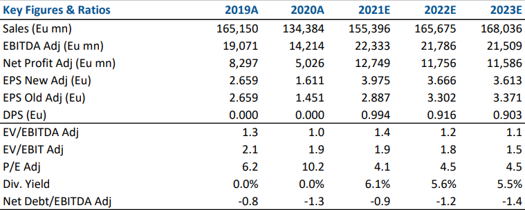 Adj. EBIT implicito a circa 15.4 mld, vs cons. a 11.7 mld, 23%/32% meglio (assumendo ricavi 2021 in linea con cons. a circa 154 mld).