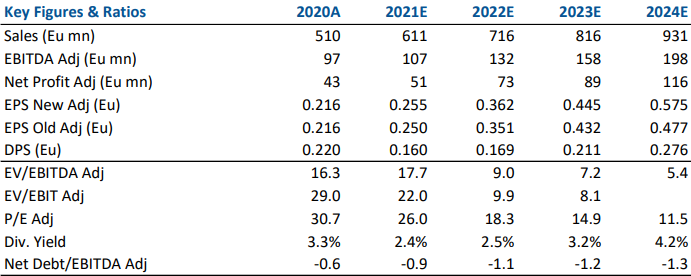 Risultati sostanzialmente in linea con le attese. La società ha proposto un dividendo sopra le attese. Positive le indicazioni sul 2022 con un fatturato visto in crescita high-teens e una marginalità in espansione di circa100 punti base anno su anno grazie alla graduale efficacia degli aumenti di prezzo implementati nel corso del 2021 e inizio 2022. Reiteriamo raccomandazione e target price considerando gli attuali livelli del tutto ingiustificati alla luce del profilo di crescita di ricavi, profittabilità e cassa.