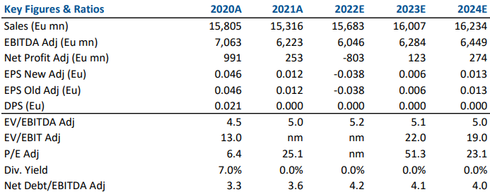 Il nostro target price di 0,42 euro riflette una valutazione base di NetCo (EV 20 mld, 10x EV/EBITDAaL) in grado di riportare il debito a livelli sostenibili e non include il potenziale rialzo di 0,20 euro/azione derivante da un re-rating della ConsumerCo a un multiplo “equo” di 6x EV/EBITDAaL asset.