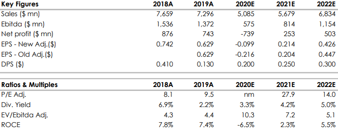 Nonostante l'ambiente ancora incerto, Tenaris ha dichiarato di aspettarsi una graduale ripresa delle vendite e dei margini nel 4trim20 e nel 2021. Adj. I margini EBITDA (escluse le spese di fine rapporto) nel 4trim20 sono attesi nella metà degli adolescenti. Si prevede un'ulteriore riduzione delle scorte nei prossimi trimestri (seppur a ritmi inferiori rispetto agli ultimi due trimestri) consentendo alla società di preservare un flusso di cassa libero positivo. Il CapEx è ora previsto a circa 200 milioni di dollari nel 2020, per poi scendere a 160-170 milioni di dollari nel 2021.
