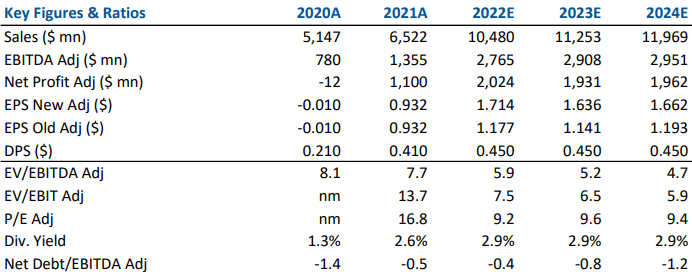 L'Ebitda cresce a quota 627 milioni di dollari, +220%. Trimestre su trimestre, l'Ebitda è cresciuto del 30% con i margini che superano il 26% in scia dell'aumento dei prezzi che hanno più che compensato l'incremento dei costi di energia e della materia prima.