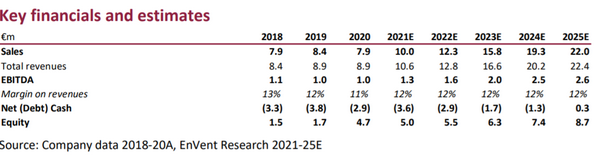- Lo scorso 4 novembre, la società ha comunicato un aggiornamento sull'andamento delle vendite 2021; il fatturato e il portafoglio ordini macchine si attestano a 9,6 milioni di euro, pari al 132% del totale del 2020.
