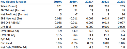 La società conferma la guidance 2020-2023, che prevede vendite pari a 275-290 milioni di euro (+15% rispetto al 2022 nella parte bassa del range), rispetto ai nostri 265 milioni. L'Ebitda è visto a 53-58 milioni rispetto ai nostri 48 milioni.