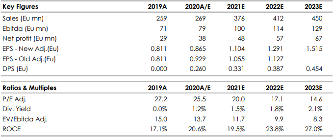Gli obiettivi al 2023 costituiscono la novità positiva dell’aggiornamento del business plan. Infatti, il tasso annuo di crescita composto (Cagr) pari al 18%, sia dei ricavi, sia dell’Ebitda, indicato dal management è superiore alla nostra stima del +16%.