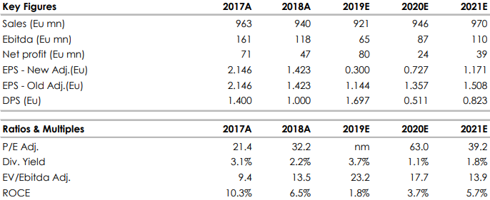 Le vendite dell'intero 2019 sono scese del 2,6% a cambi correnti a 916 milioni, un dato superiore alle attese. Le vendite omogenee sono scese nell'anno del 4%, in lieve miglioramento rispetto al -4,7% registrato nei primi nove mesi.