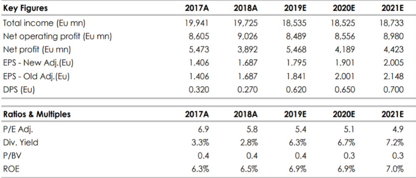Riteniamo, inoltre, che la dirigenza abbia posto le basi per un recupero di redditività in grado di portare ad un forte incremento del dividendo. Stimiamo un incremento da 0,27 euro a 0,65 euro per azione sui risultati 2019, per uno yield superiore al 6%.