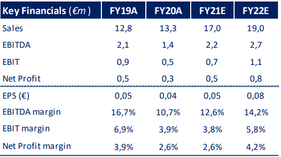 Nella nota si legge che: “Alla luce dei risultati pubblicati e delle operazioni concluse, modifichiamo le nostre stime sia per l’anno in corso sia per i prossimi anni. In particolare, ci aspettiamo ricavi 2021 pari a 17 milioni di euro ed un EBITDA pari a 2,15 milioni, corrispondente ad una marginalità del 12,6%. Per gli anni successivi, ci aspettiamo che i ricavi possano aumentare fino a 21 milioni (CAGR 20-23: 16,34%) nel 2023, con EBITDA pari a 3,30 milioni (corrispondente a d un EBITDA margin del 15,7%), in crescita rispetto ai 1,42 milioni del 2020 (corrispondente ad un EBITDA margin del 10,7%).