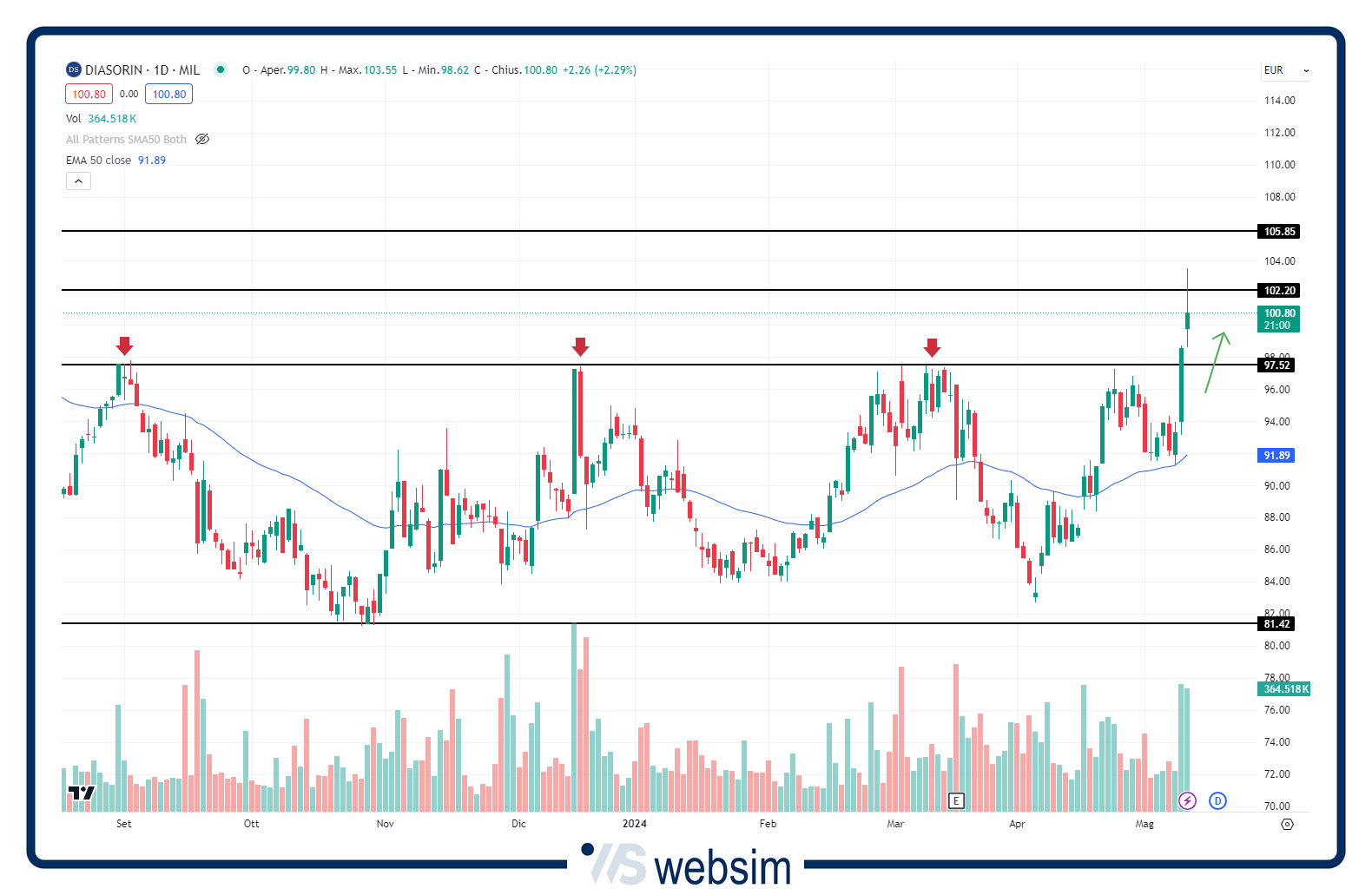 DIASORIN [DIAS.MI] (101,2 eu, Long da 100 eu) +2,75%. Tra i best performer di seduta all'interno del paniere principale di Milano. Il titolo beneficia dei conti del primo trimestre presentati venerdì scorso a mercati aperti, risultati che hanno convinto investitori e analisti. In particolare, la società ha avviato l'anno mostrando una solida crescita sia a livello di crescita organica del fatturato ma anche dei margini. Dal punto di vista tecnico, con la seduta di oggi è stato compiuto il breakout rialzista della resistenza statica a quota 97,5 eu, un'area di prezzo che nel corso dell'ultimo anno di negoziazione ha respinto più volte al ribasso il titolo. Siamo entrati in posizione long per continuare a beneficiare del potenziale upside.