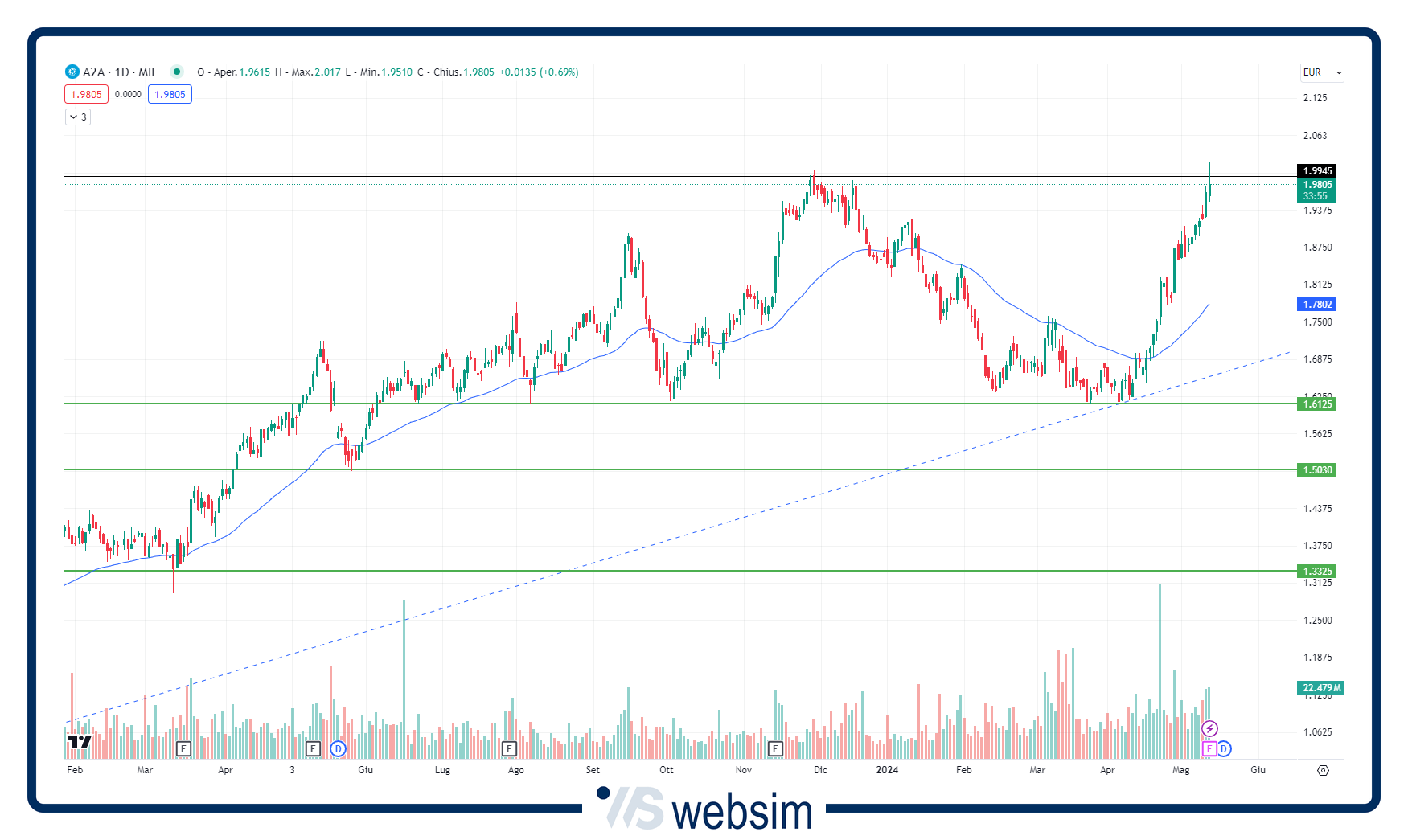 A2A [A2.MI] (1,98 eu, Long da 2 eu) +0,6%. Il gruppo ha chiuso il primo trimestre del 2024 con un balzo del 70% dell'utile netto salito a quota 294 milioni di euro, con l'Ebitda a 703 milioni, in crescita del 40% rispetto al medesimo periodo dello scorso anno. Graficamente, il titolo con la seduta in verde di oggi ha raggiunto in intraday i livelli di prezzo più alti dal settembre 2008. In tal senso, un deciso breakout (confermato da volumi di negoziazione in aumento) dell'area di resistenza ostica intorno a 2 eu potrebbe spingere le quotazioni ulteriormente al rialzo.
