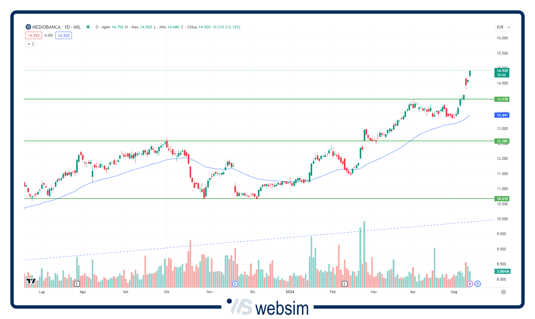 I titoli proposti sono una selezione delle strategie di Analisi Tecnica di Websim.it, e non rappresentano un Portafoglio consigliato. Per gli aggiornamenti, si rimanda alla rubrica quotidiana Tecnica Migliori Titoli, pubblicata sera&mattina nella sezione Investimenti/Analisi Azioni.