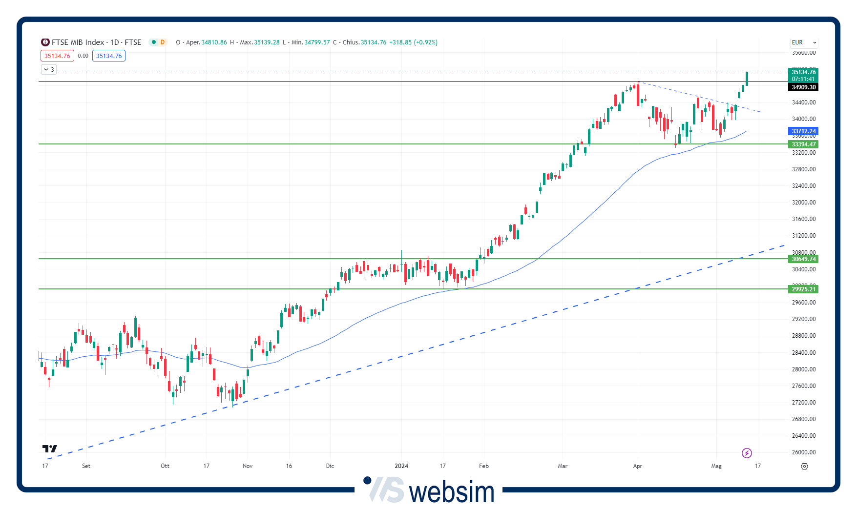 FTSEMIB (35.140 punti, +0,94%). Con gli acquisti di settimana scorsa (+3%), è migliorato ulteriormente il quadro grafico del paniere principale di Piazza Affari, con l'indice Ftse Mib che ha amplificato i guadagni dopo il breakout al rialzo dell'area di resistenza a 34.400/34.500 punti. Con gli acquisti della seduta odierna, il listino delle blue chip italiane ha dato un altro importante segnale di forza superando l'area di resistenza a 34.900 punti e segnando così nuovi massimi degli ultimi sedici anni. Si conferma come uno dei listini più tonici del momento (+14,7% da inizio anno, +27,6% nell'ultimo anno di negoziazione).