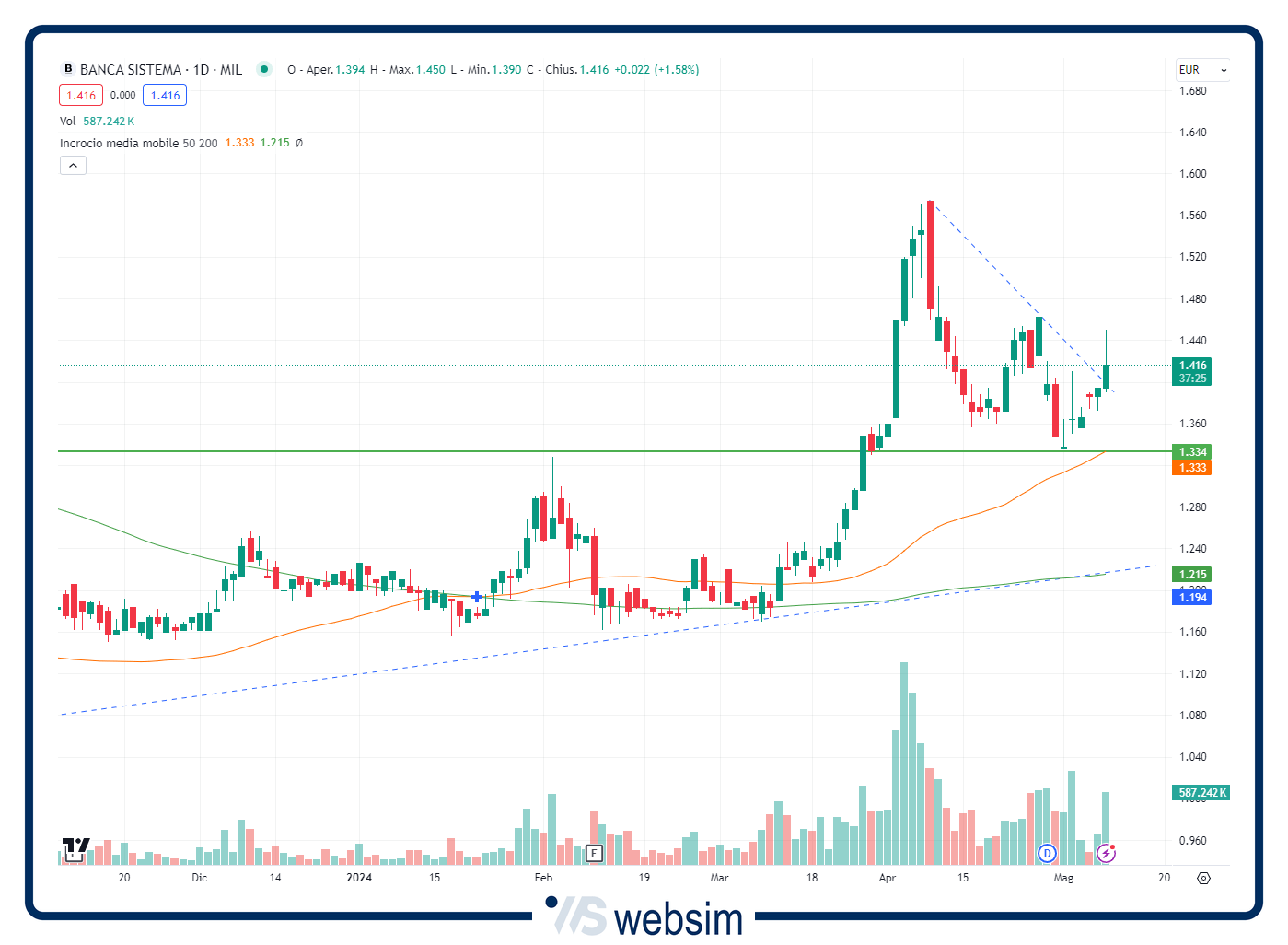 BANCA SISTEMA [BSTA.MI] (1,41 eu, Long da 1,36 eu) +1,2%. Seduta positiva per il titolo che, dopo aver messo a segno un rimbalzo dall'area supportiva a quota 1,33 eu, con la candela verde odierna ha compiuto il breakout rialzista della resistenza poco sotto a 1,4 eu, livello peraltro da cui transita anche la trendline ribassista costruita dai top di quest'anno. Rimaniamo in posizione.