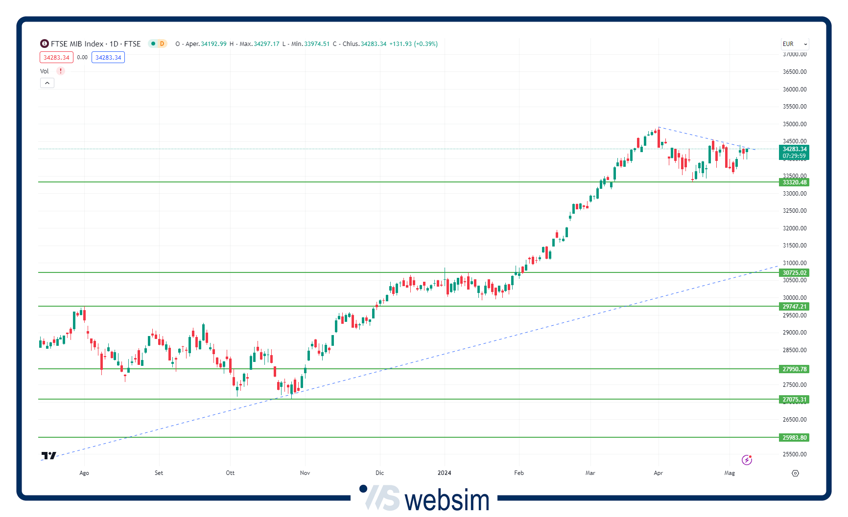 FTSEMIB (34.300 punti, +0,44%). Fase di consolidamento per il listino principale di Piazza Affari: da metà marzo si muove nel trading range compreso tra l'area supportiva a 33.500 punti e quella di resistenza a 34.800 punti. Dal punto di vista grafico, l'indice Ftse Mib si mantiene al di sopra delle principali medie mobili a 50 e 200 giorni, molto vicino all'area di resistenza a 34.400 punti. Si conferma come uno dei più tonici del momento (+12% da inizio anno, +24% nell'ultimo anno).