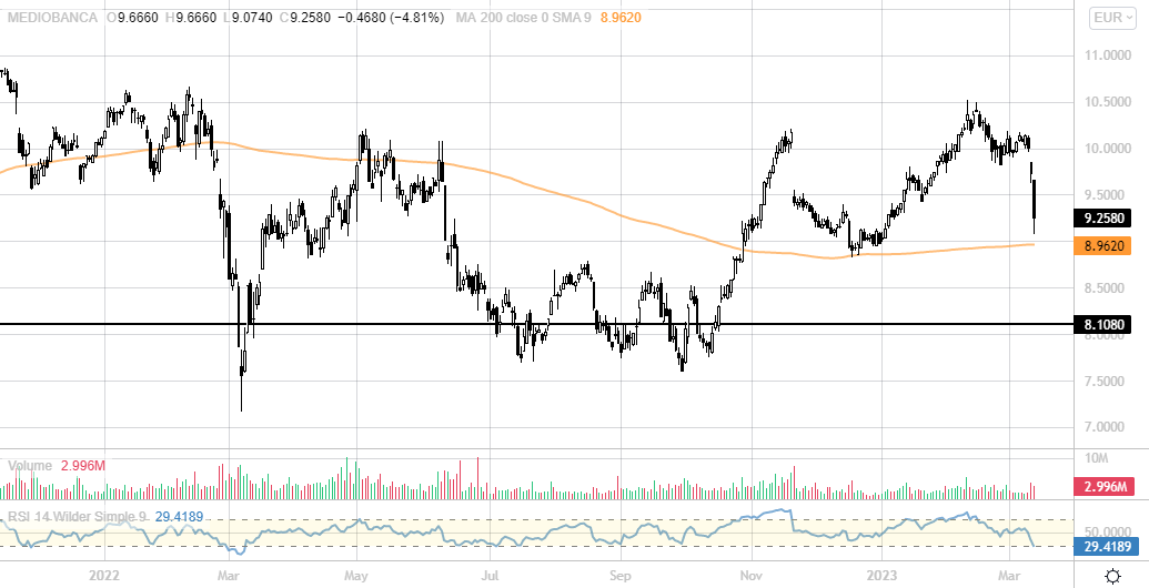 MEDIOBANCA [MDBI.MI] (9,27 eu) -4,6%. Si riporta in area 9 eu dove convergono supporti statici e dinamici (media mobile 200 periodi). Buon punto d'ingresso.