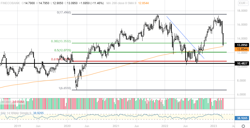 FINECOBANK [FBK.MI] (13,08 eu, Long da 13 eu) +0,4%. Prezzi tornati su un supporto statico e dinamico importante. Titolo presente nel Portafoglio LONG Piazza Affari, suggerito da websim.it