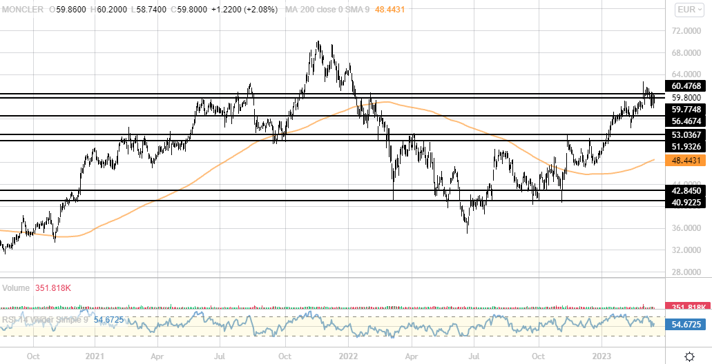 MONCLER [MONC.MI] (59,8 eu) +2%. Inserito in un trend rialzista molto solido affronta la resistenza chiave a 60 eu. Subisce la volatilità di mercato in questi giorni. Si compra su chiusura sopra 61 eu. Titolo presente nella rubrica titoli sexy di Websim.it.