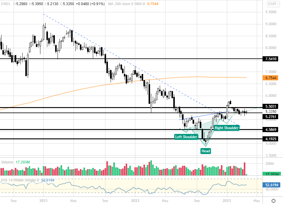 ENEL [ENEI.MI] (5,33 eu, Long da 5,25 eu) 0,9%. Il testa e spalle rialzista è ancora valido fino ad un eventuale rottura dei 5 eu e sta permettendo al titolo di tenere area 5,2/5,3 eu sovraperformando. Si può comprare. Titolo presente nella rubrica titoli sexy di Websim.it.
