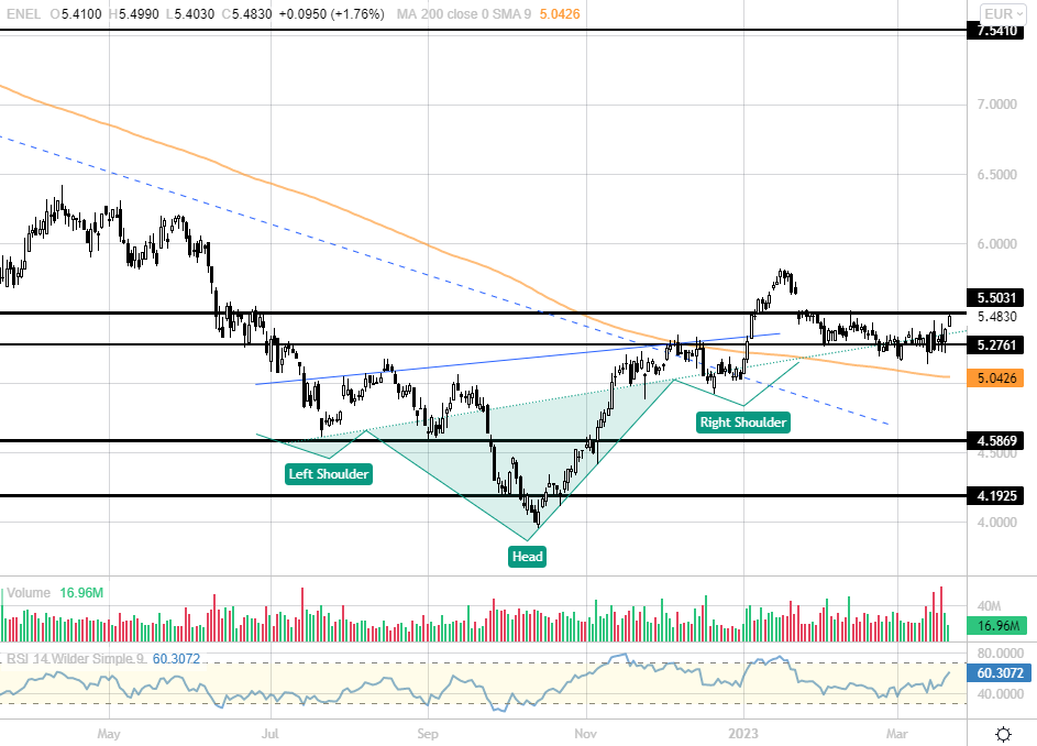 ENEL [ENEI.MI] (5,47 eu, Long da 5,25 eu) +1,6%. Il testa e spalle rialzista è ancora valido fino ad un eventuale rottura dei 5 eu e sta permettendo al titolo di tenere area 5,2/5,3 eu sovraperformando. Si può comprare. Titolo presente nella rubrica titoli sexy di Websim.it.