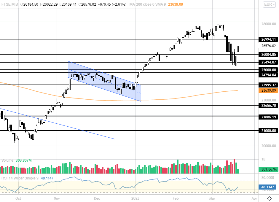 FTSE MIB (26.579,34 punti, +2,62%). Due sedute di rimbalzo forte dell'indice. Nel mirino i 27.000 punti. Questa la resistenza da infrangere per tornare sui massimi.