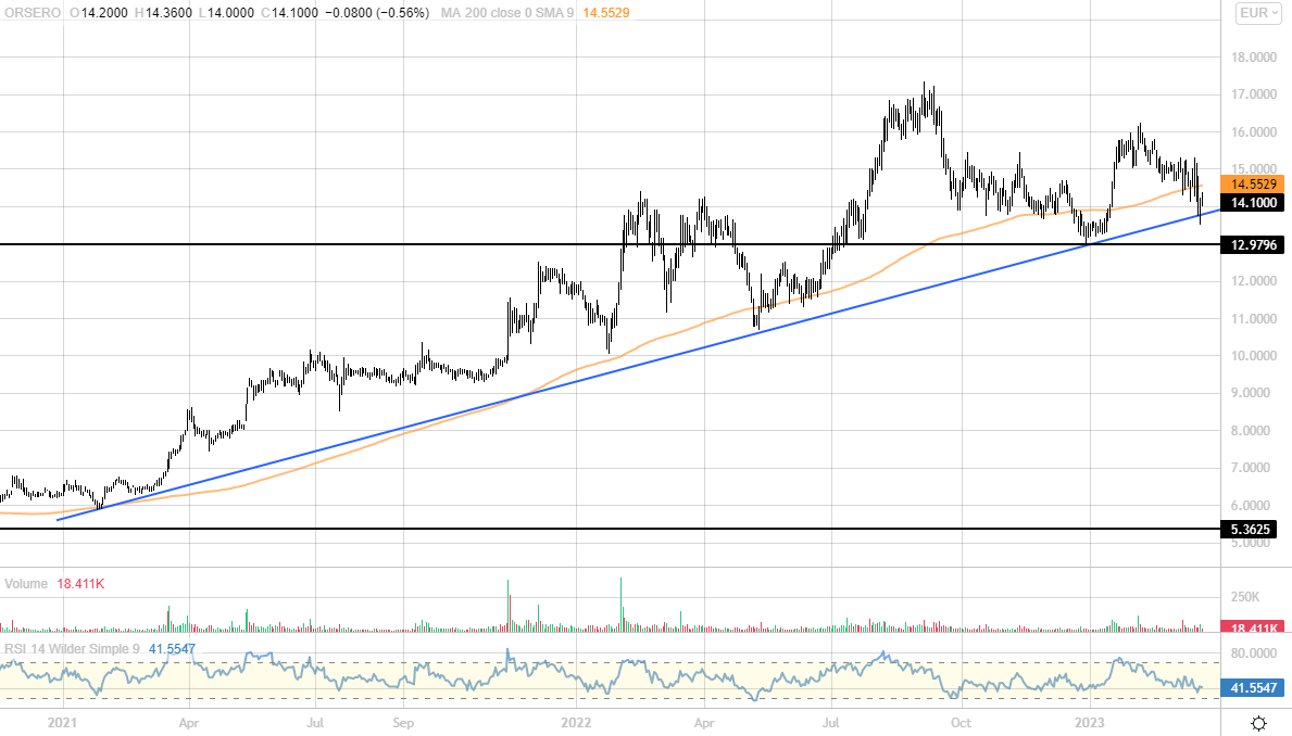ORSERO [ORSO.MI] (14,1 eu, Long da 14,5 eu) -0,6%. Dai minimi di maggio 2020 ha avviato un trend rialzista molto forte più volte confermato dal test della trend line ascendente. I corsi ora si trovano a testare nuovamente il supporto dinamico. Si compra anche in caso di cali fino a 13 eu.