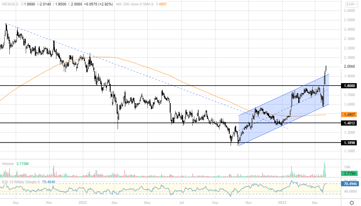 WEBUILD [WBD.MI] (2 eu, Long da 1,8 eu) +3%. Dai minimi di metà ottobre il titolo prosegue lungo un canale rialzista ben delineato. Molto positiva la rottura con forte volatilità e volumi della resistenza a 1,8 eu. A questi prezzi e su ritracciamenti a 1,8 eu si compra.