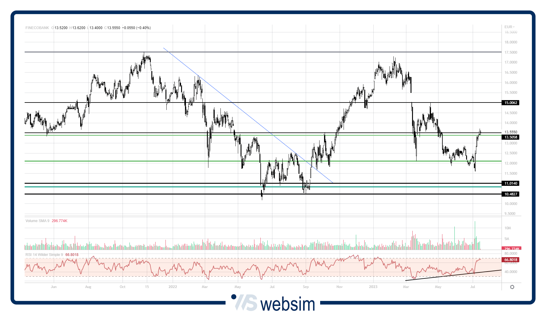 FINECO [FBK.MI] (13,53 eu, Long 12,5 eu) -0,6%. Terza settimana di deciso allontanamento dalla base della banda, 10/11,5 -16,5/17,5 eu, all'interno della quale alterna uptred e downtrend di breve termine dal 2020. Prezzi ancora non distanti dal nostro livello d'acquisto. Titolo presente nella selezione di analisi tecnica Titoli CALDI.