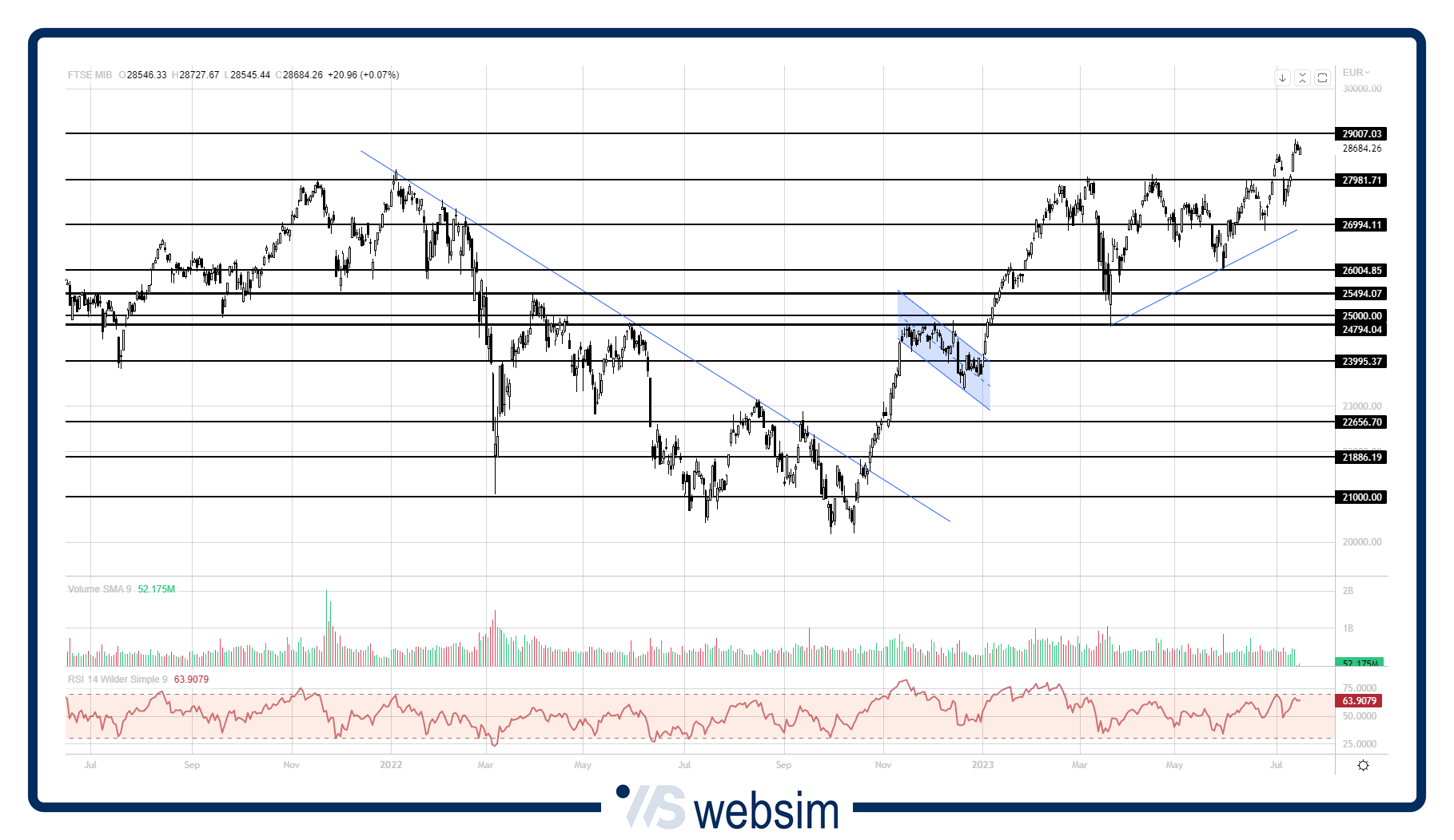 FTSE MIB (28.541,02 punti, -0,43%). Con il balzo di questi giorni è stato non solo recuperato il calo della scorsa settimana, ma i nuovi top (massimi dal 2008) segnati forniscono rinnovata linfa al rally in corso dallo scorso autunno. Tornano ad aumentare le chances di toccare area 30mila punti in tempi brevi.