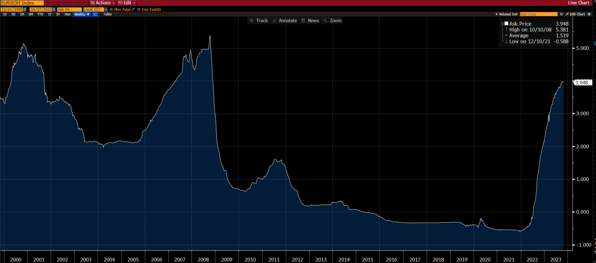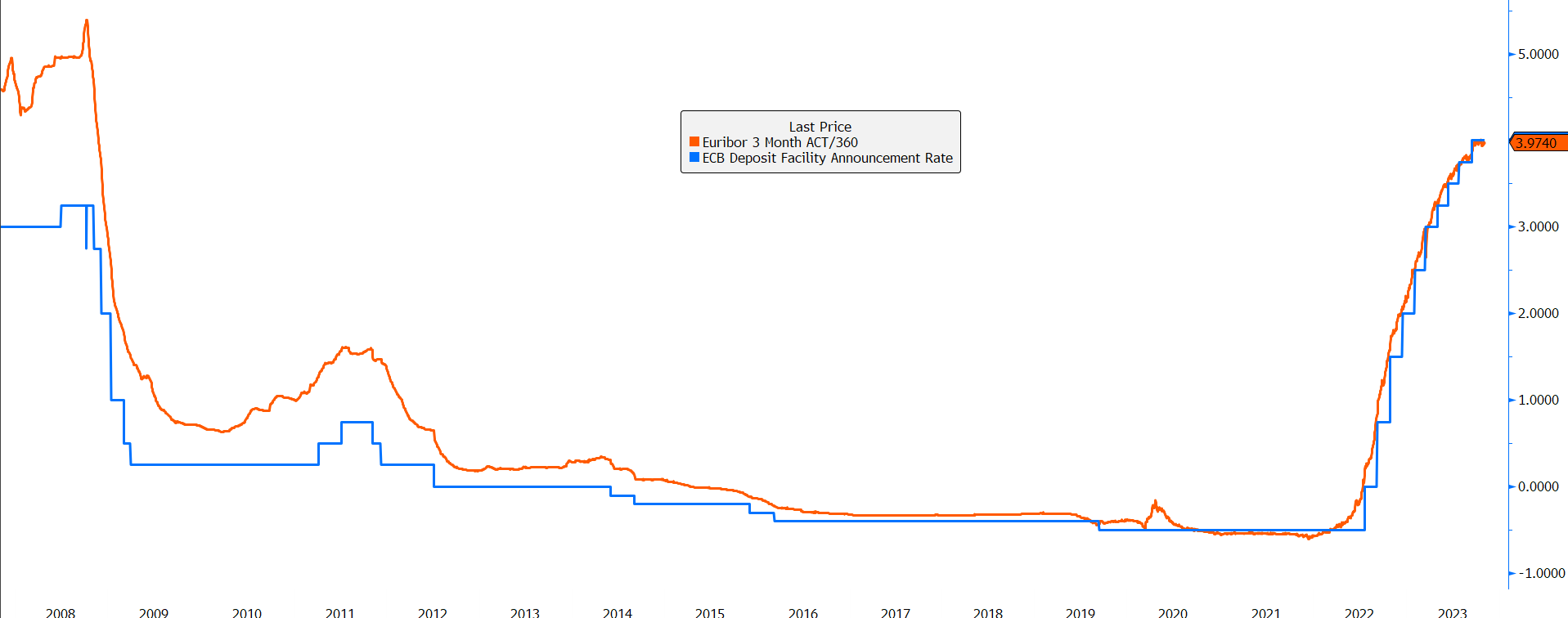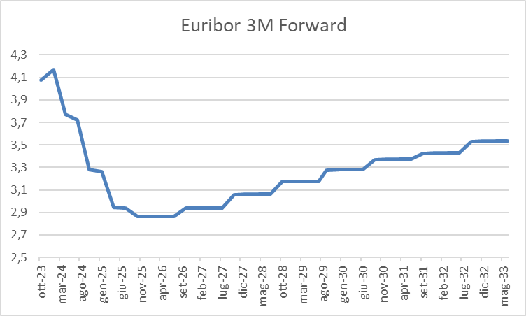 Il tasso Euribor 3M è quello canonicamente utilizzato anche perché approssima il tasso sui depositi della BCE. Quest’ultimo è diventato progressivamente il vero tasso di riferimento per la BCE, dopo l’introduzione di numerose manovre di espansione della liquidità tramite le operazioni LTRO/TLTRO. Il tasso sui depositi presso la BCE è attualmente al 4%, come pure di fatto il tasso euribor 3 mesi che lo approssima molto bene. In questo modo seguiamo 1 a 1 quelle che sono le manovre della BCE sul tasso sui depositi che è quello che il mercato guarda maggiormente.