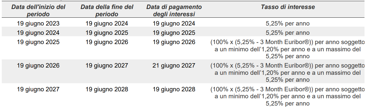 Sotto riportiamo il calendario del Bond con le date più importanti e tasso d’interesse pagato.