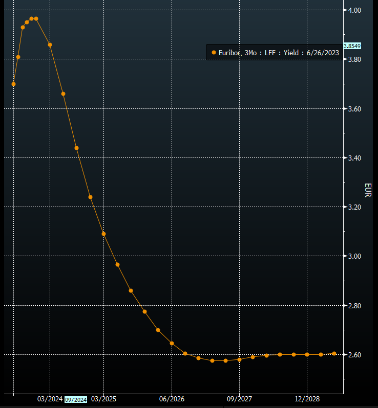 Sotto la curva forward dei futures sul tasso Euribor 3 mesi che appunto mostra quali sono le attese del mercato.