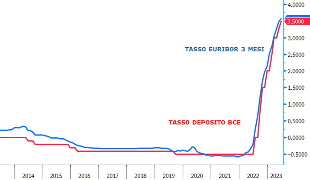 Abbiamo scelto il tasso Euribor 3 mesi perché è quello canonicamente utilizzato, ma anche perché il tasso che è diventato di riferimento per la BCE è il tasso sui depositi (perché su quello è parametrato anche il costo delle operazioni TLTRO). Questo è arrivato al 3,5% ed il tasso Euribor 3 mesi approssima molto bene proprio il tasso sui depositi della BCE. In questo modo seguiamo pressoché 1 a 1 quelle che sono le manovre della BCE sul tasso sui depositi che è quello che il mercato guarda di più.