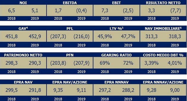Il GAV consolidato ammonta a 452,9 milioni di euro (451,8 milioni nel primo semestre 2018). Il Gav (Gross Asset Value) corrisponde al valore totale dell’attivo immobiliare calcolato a valori correnti di mercato.