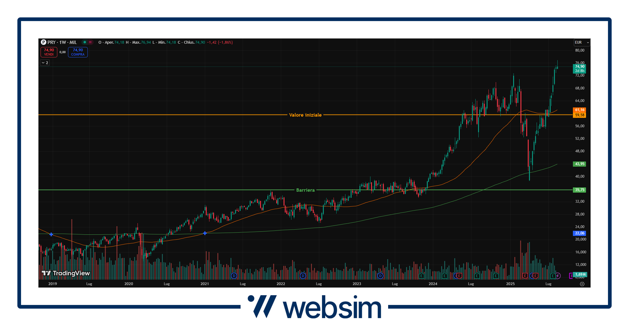 Continua anche dopo la comunicazione dei risultati relativi al 2Q25 il trend positivo iniziato da Prysmian, risultati positivi che evidenziano una crescita organica superiore alle attese e trainata dal settore Transmission, con un conseguente aggiornamento della guidance FY25. Da sottolineare che l’azienda è anch’essa intaccata dai possibili dazi protezionistici che ormai sono argomento di discussione e trattative da diversi mesi, nello specifico quelli previsti sul rame. In questo caso però, Prysmian aveva evidenziato un impatto positivo dai dazi sul rame rispetto ai concorrenti dovuta alla sua maggiore integrazione verticale. Il titolo quota attualmente in area 74,86 EUR, con un valore iniziale fissato a 59,58 EUR ed una barriera, come detto valida sia per coupon che per capitale a scadenza, a 35,748 EUR.