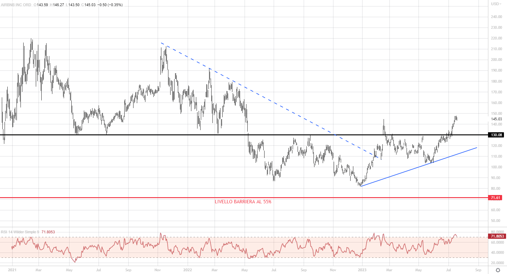 Airbnb è una piattaforma rivoluzionaria che ha cambiato il modo in cui le persone viaggiano. Ha reso possibile trovare alloggi economici e unici in tutto il mondo. Airbnb ha anche contribuito a creare un'economia collaborativa in cui le persone possono condividere le proprie risorse con gli altri. La società capitalizza ora 92 mld di usd, mentre è stata fondata nel 2007 da Brian Chesky, Joe Gebbia e Nathan Blecharczyk, allora studenti universitari del politecnico di SanFrancisco. Airbnb è cresciuto rapidamente negli ultimi anni e oggi è disponibile in oltre 100.000 città in 191 paesi. La piattaforma conta oltre 1 miliardo di utenti registrati e oltre 7 milioni di host. Sulle prospettive del titolo gli analisti sono abbastanza positivi con 18 buy, 19 hold e solo 5 sell. Target price sui prezzi attuali. L’utile dovrebbe raggiungere i 2,5 mld nel 2023, per arrivare a 3,1 mld nel 2025. L’EPS passerà da 3,5 a 4,8 dollari ad azione (+37%) e il free cash flow da 3,8 mld a 4,8 mld. La società evidenzia una certa solidità strutturale. Nel 2023 il titolo ha guadagnato il 68%, grazie all’espansione della società in nuovi mercati (tra cui India, Brasile e Cina). Questo ha aiutato Airbnb a raggiungere un pubblico più ampio e ha contribuito alla crescita dei suoi ricavi. Airbnb ha anche introdotto una serie di nuove funzionalità e servizi. Ha lanciato un nuovo programma di fidelizzazione per gli host, ha migliorato la sua funzione di ricerca e ha introdotto nuove opzioni di pagamento. Graficamente si vede come la barriera del certificato è posta a 71,61 usd, sotto i minimi storici.