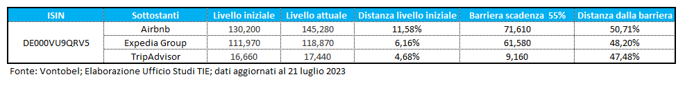 Con gli italiani scalpitanti e pronti per partire per le ferie (per chi già non lo avesse fatto), non potevamo non proporvi anche un certificato sul tema viaggi e vacanze. E lo facciamo con il certificato di Vontobel ISIN DE000VU9QRV5 che investe su Airbnb, Expedia Group e TripAdvisor. Tre società che ci aiutano ogni anno a scegliere, pianificare e prenotare i nostri viaggi. Un certificato anche molto generoso, cosa che non dispiace visto che mediamente l’italiano spenderà 1.500 euro per persona per le vacanze estive (dati Ipsos). Un aumento del 10% rispetto al 2022. Il prodotto infatti paga premi mensili con memoria del 1,3%, pari ad un rendimento annuo del 15,6%. I premi sono condizionati ad una barriera al 55%, quindi profonda (valida anche a scadenza, luglio 2026).