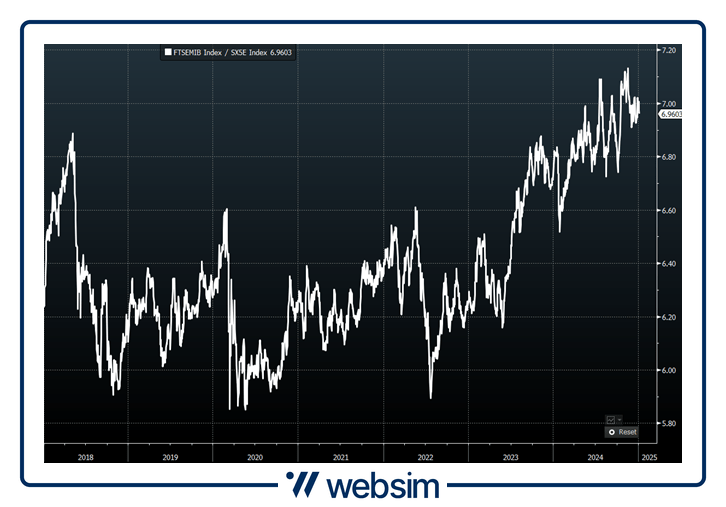 In realtà, forse non tutti se ne sono accorti, ma la sovra-performance del mercato italiano rispetto al resto d’Europa continua dal post covid e ciò è ben visibile dal grafico del rapporto Ftse Mib Index/ Euro Stoxx 50 Index: