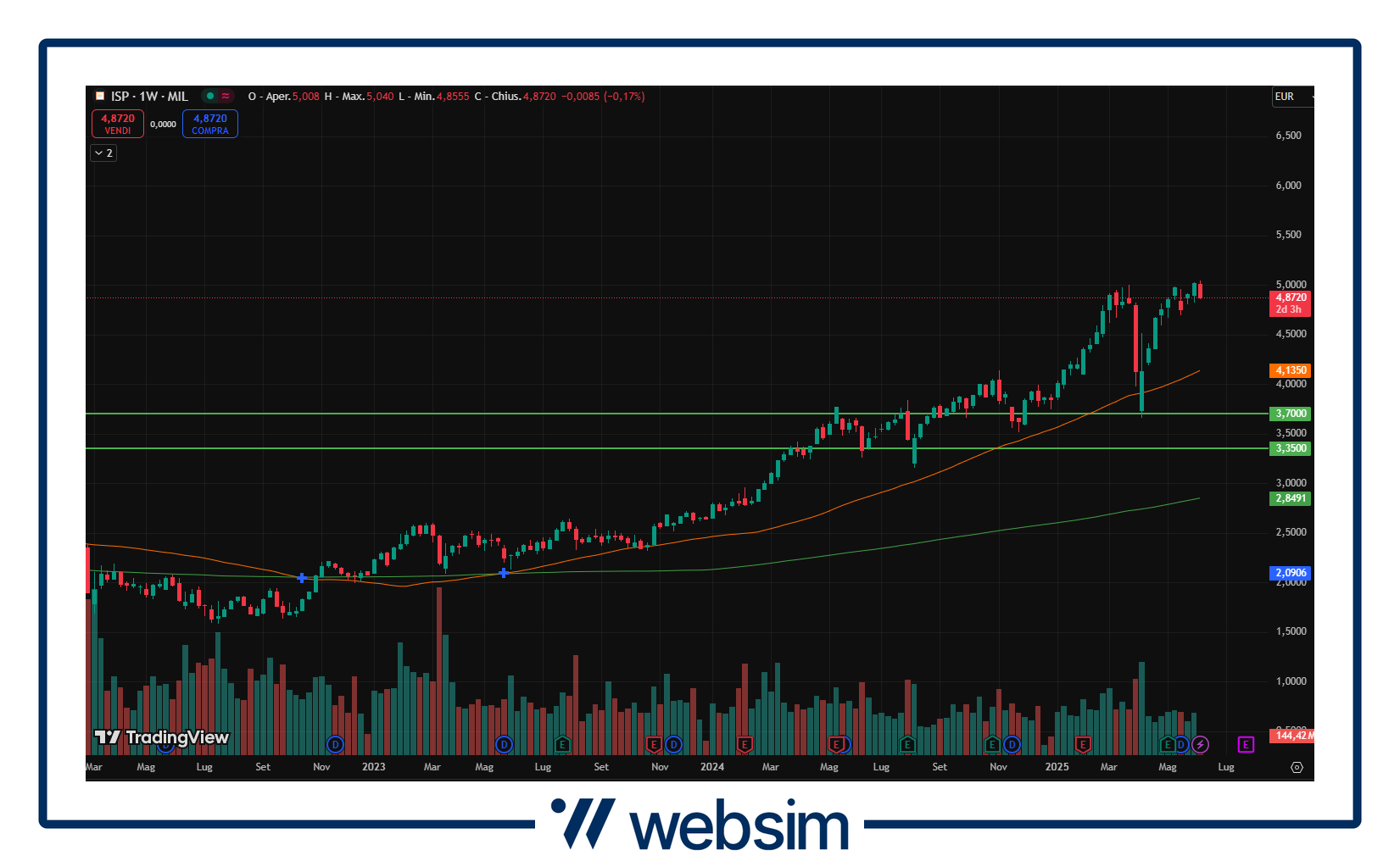 Fiore all’occhiello del settore bancario italiano, Intesa continua senza grandi difficoltà il suo rally rialzista nonostante i ritracciamenti di settore, a dimostrazione della solidità del trend e della qualità del titolo, così come dimostrato anche sia dai numeri riportati che dai target dell’anno. Intesa attualmente quota in area 4,89 EUR con supporti posti in area 3,7 e 3,35 EUR.