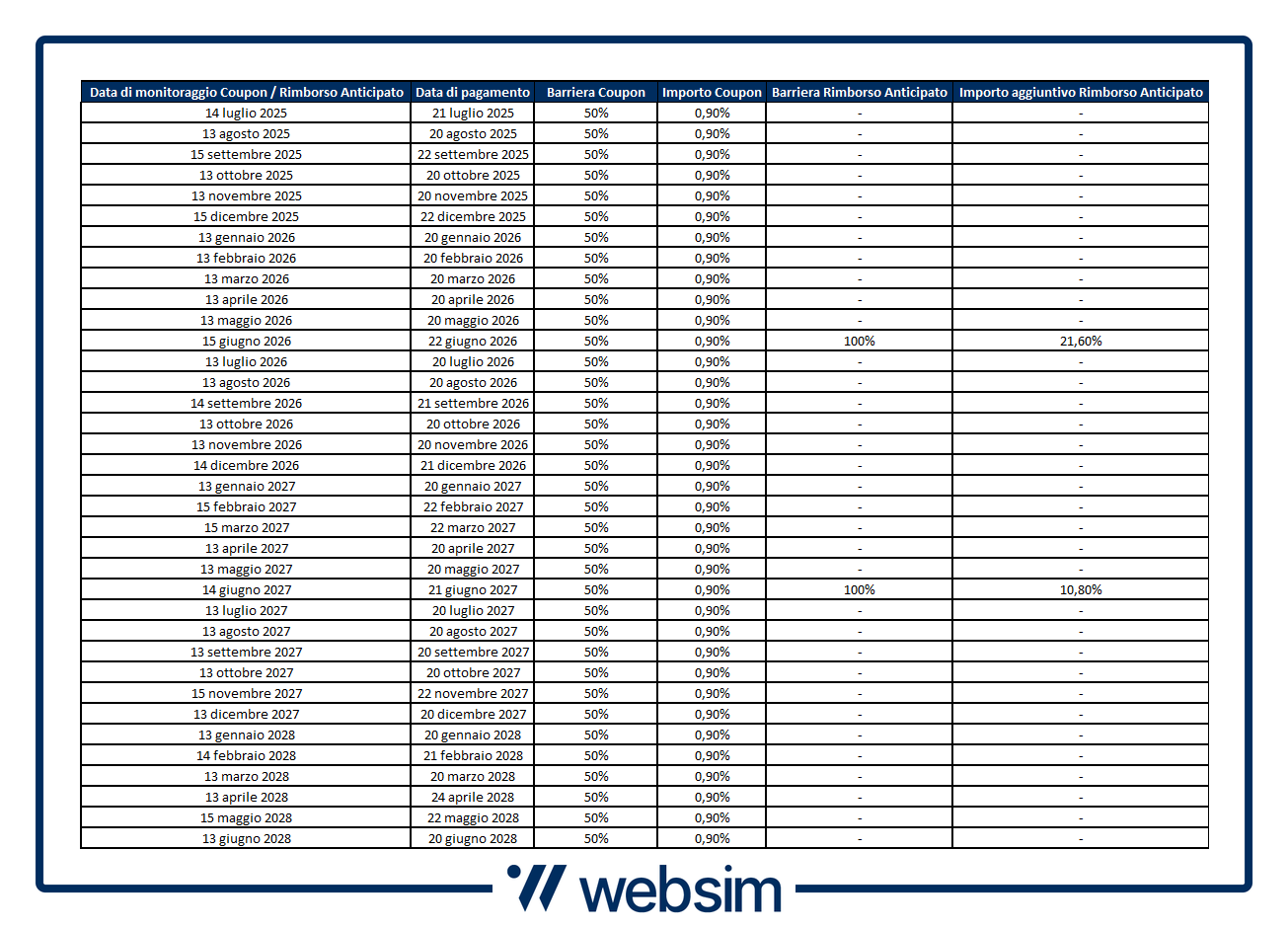 Da sottolineare che il prodotto arriva come vero e proprio successore di un prodotto emesso l’anno scorso, l’All Coupon di Barclays con ISIN XS2777229332, rimborsato negli scorsi giorni anticipatamente appena dopo 1 anno e che, come descritto, ha riconosciuto in aggiunta al coupon previsto ed al valore nominale anche la somma dei coupon futuri che erano programmati nella schedule del certificato (e che in quel caso ammontavano al 22,56%).