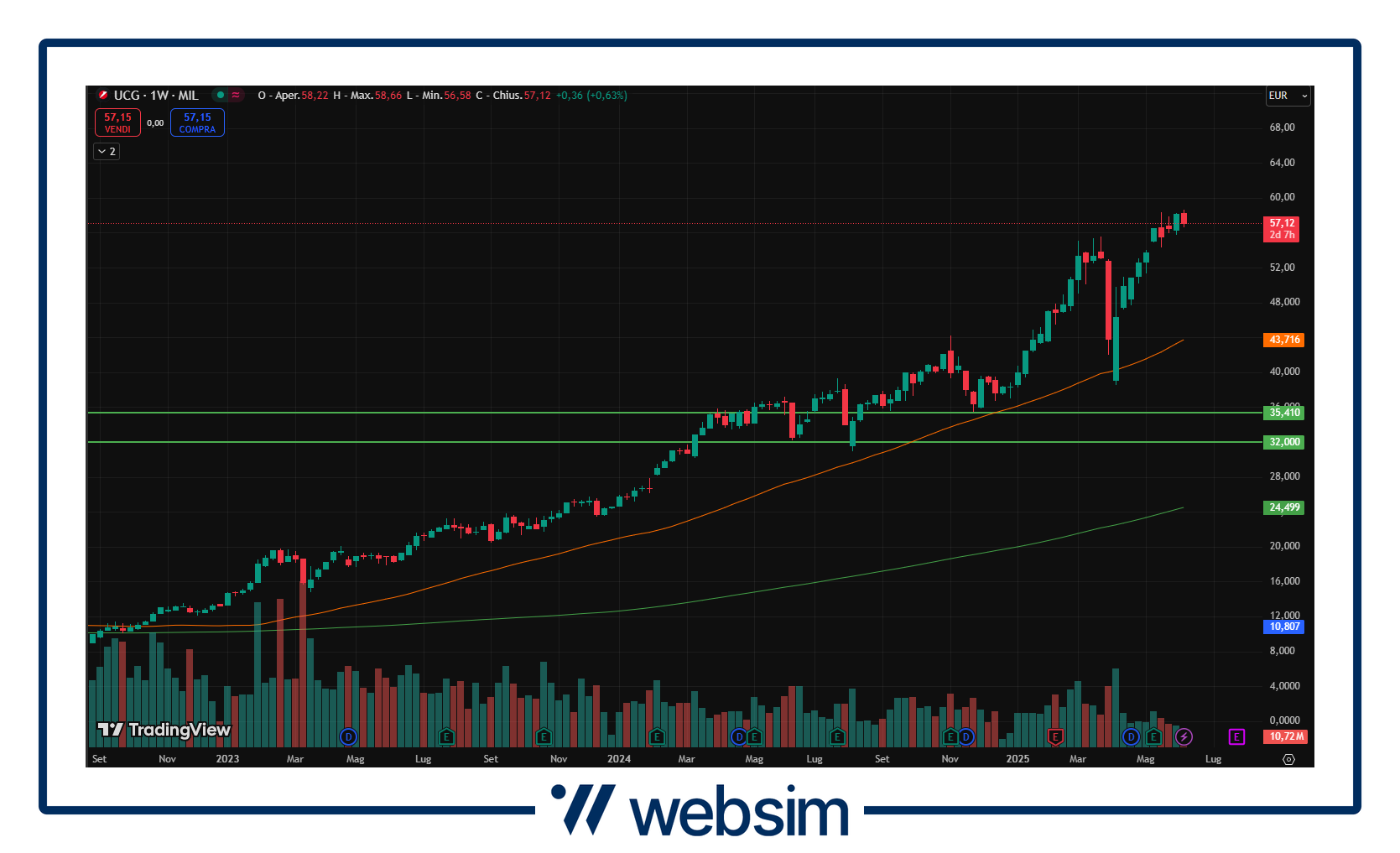 Altra grande possibile protagonista di quelli che potranno essere i prossimi sviluppi di consolidamento del settore bancario è senza dubbio Unicredit. La partita per la possibile acquisizione di Banco BPM va avanti su piu fronti, sia commerciali/finanziari che politici. In tutto questo l’istituto ha fatto sapere alla UE la volontà di cedere 200 sportelli della suddetta target nel caso in cui l’offerta vada a segno in modo da far fronte ad eventuali quote di mercato eccessive e, contemporaneamente, continuano le operazioni per liverarsi delle rimaste esposizioni al mercato russo. Il titolo quota attualmente in area 57 EUR, con un area di supporto compresa tra i 32 e 35 EUR.