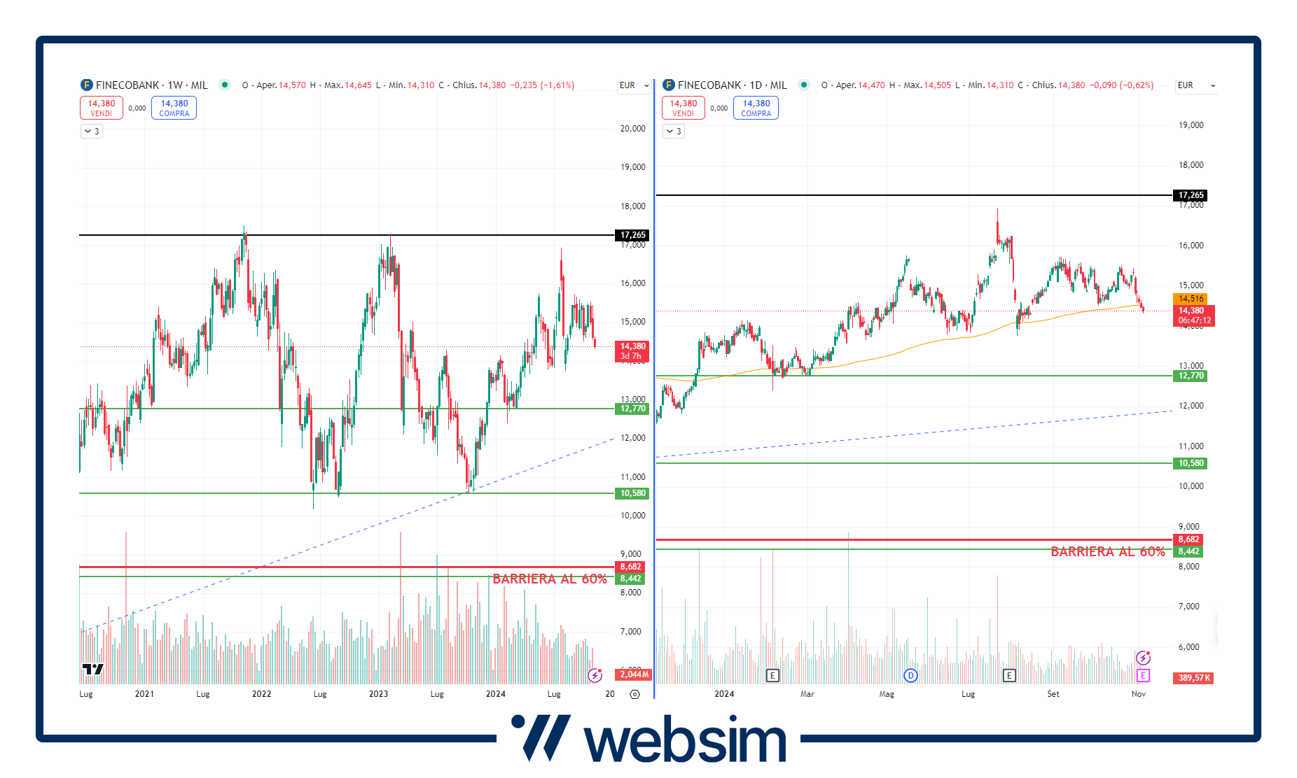 Da una certa sicurezza anche il posizionamento della barriera al 60% su Fineco che si trova a 8,68 euro. Sul titolo le aree di supporto più rilevanti si trovano a 12,7 euro e poi nei pressi di quota 10 - 10,5 euro.