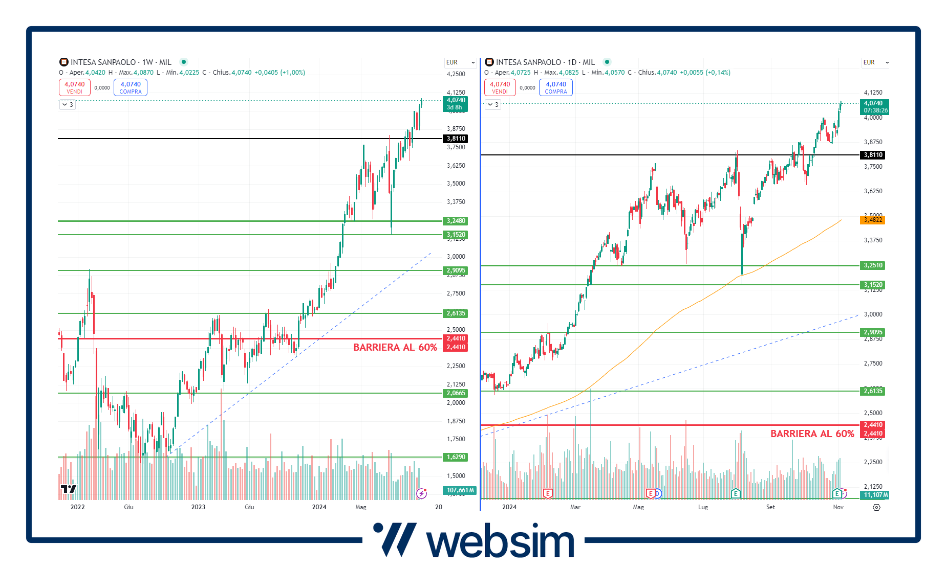 Su Intesa la barriera al 60% si trova a 2,44 euro, livello di prezzo sotto le principali aree di supporto situate a 4 euro, 3,25-3 euro e 2,6 euro ad azione.