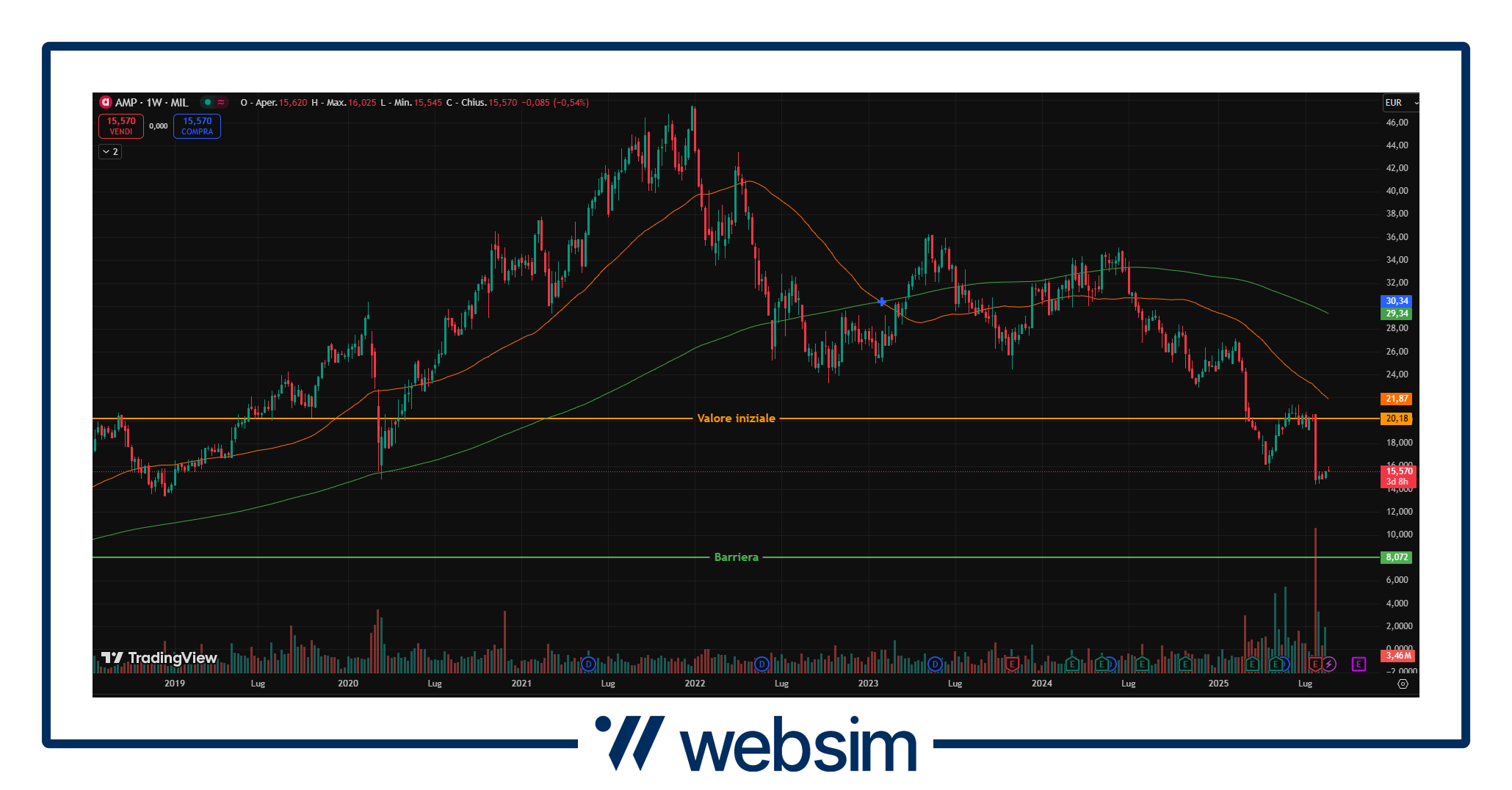 Dopo il crollo fatto registrare poche settimane fa il titolo sta lentamente cercando di ritracciare e recuperare il terreno perso a seguito della comunicazione dei risultati. Le ultime notizie però, in particolare le indicazioni di GN, sembrano supportive nei confronti dell’azienda, che rimane comunque con una minore crescita attesa (+1%, precedentemente +5%) a riflesso dell’elevata esposizione all’EMEA, regione che ha mostrato particolare debolezza negli ultimi mesi. Il titolo quota attualmente in area 15,58 EUR, con un valore iniziale fissato a 20,18 EUR e barriera a 8,072 EUR.