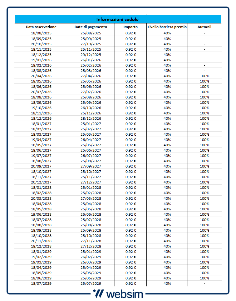 A partire da aprile 2026, ed a seguire alle stesse date di osservazione per il pagamento dei coupon, il certificato avrà anche la possibilità di essere richiamato anticipatamente. Tramite il meccanismo di Autocall se infatti ad una di queste date tutti i sottostanti verranno osservati con dei prezzi pari o superiori ai rispettivi livelli iniziali, il certificato verrà rimborsato anticipatamente al valore nominale, a cui aggiungere ovviamente la precedente discussa cedola.
