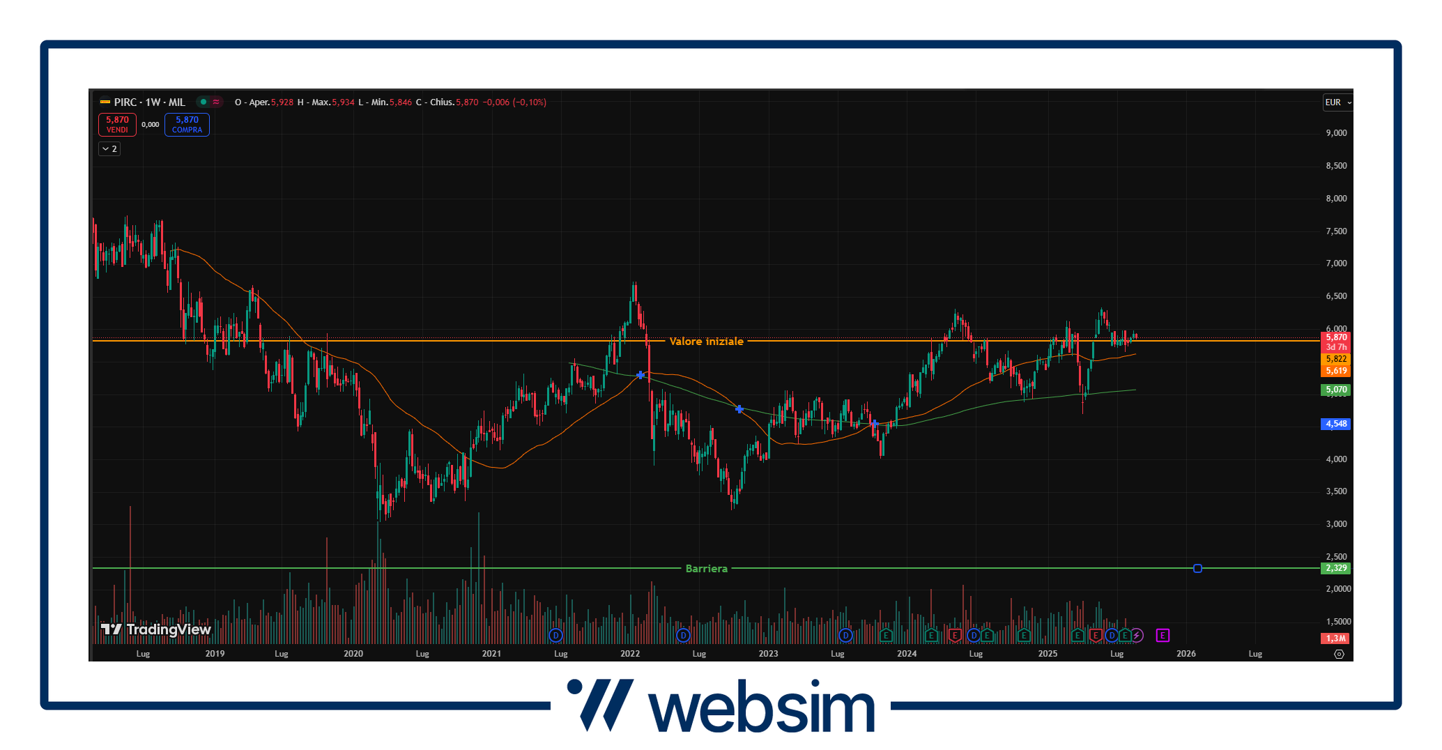 Pirelli ha riportato una serie di risultati per il 2Q25 più che solidi e soprattutto in linea con quelle che erano le aspettative degli addetti ai lavori. Ancora più importante la guidance che è stata confermata, grazie a un mix/prezzi più forte e all'esecuzione del piano di mitigazione per i dazi, nonostante uno scenario esterno sfavorevole (FX, tariffe). Il titolo quota attualmente in area 5,87 EUR, con un valore iniziale fissato a 5,822 EUR e barriera a 2,3288 EUR.