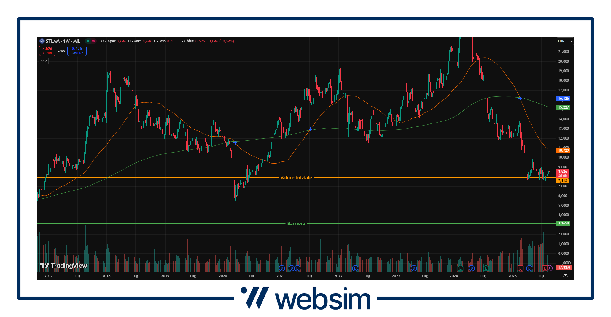 Stellantis continua il trend non troppo brillante che ormai continua da diverso tempo, complice anche e soprattutto uno scenario macro di settore non troppo favorevole. Notizia degli ultimi giorni è la produzione ridotta e ordini limitati di alcuni modelli di veicoli elettrici e ibridi plug-in negli Stati Uniti. La decisione è legata al calo atteso della domanda di questi veicoli, in vista della rimozione dal prossimo 30 settembre del credito d’imposta federale da $7,500, che finora aveva sostenuto le vendite. Tuttavia, tale trend non rappresenta un problema per Stellantis: i volumi di vendita di questi veicoli sono già limitati, il contributo agli utili è marginale e le recenti modifiche normative hanno azzerato la multa in relazione ai target sulle emissioni. Il titolo quota attualmente in area 8,527 EUR, con un valore iniziale fissato a 7,913 EUR e barriera a 3,1652 EUR.