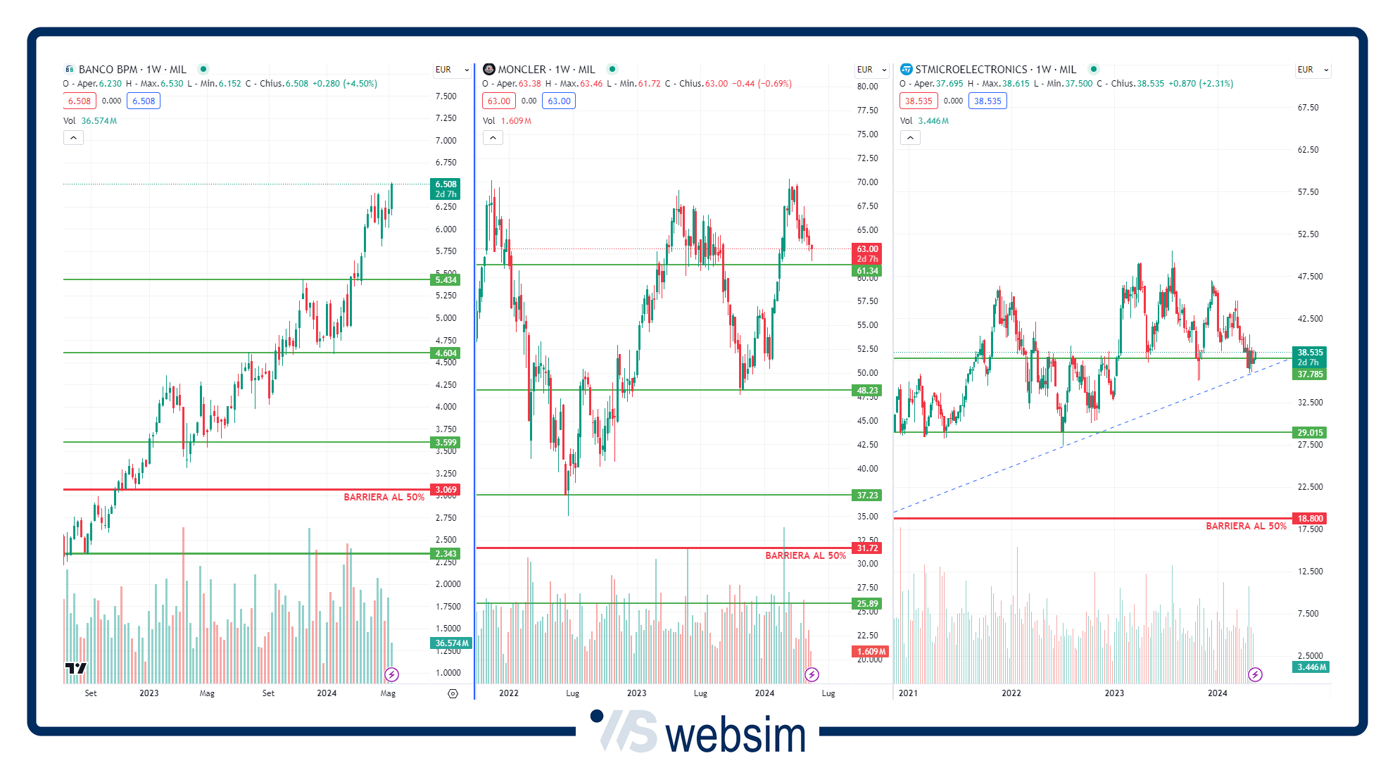 Si presentano molto bene anche i tre titoli scelti per il basket dato che stiamo parlando del colosso bancario Banco BPM, del brand del lusso Moncler e del produttore di chip STMicroelectronics. Tre nomi ben conosciuti dagli investitori italiani e che dato che operano in tre settori diversi permettono di diversificare il proprio portafoglio. Nella tabella e nei grafici (su time frame settimanale) qui sotto possiamo vedere l'andamento dei titoli del paniere e come le barriere al 50% si trovino al di sotto di aree supportive importanti su tutti e tre le aziende.