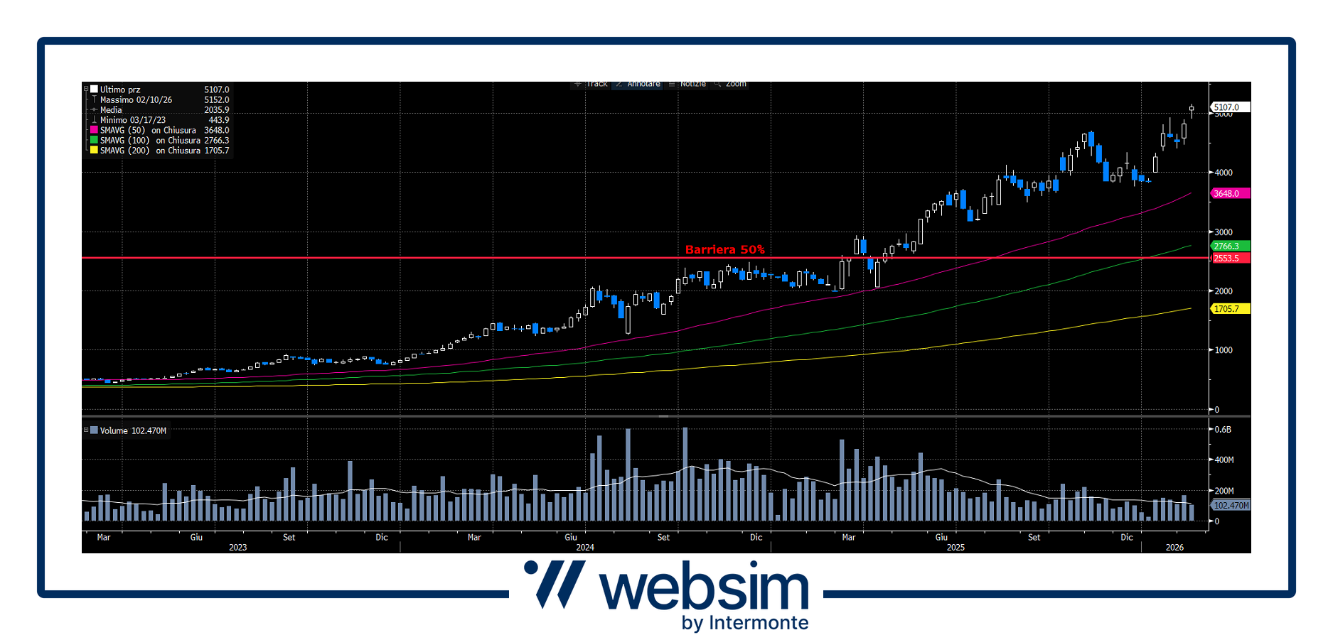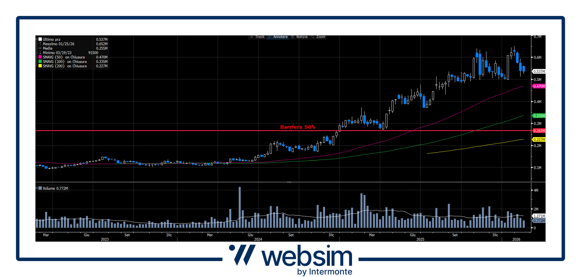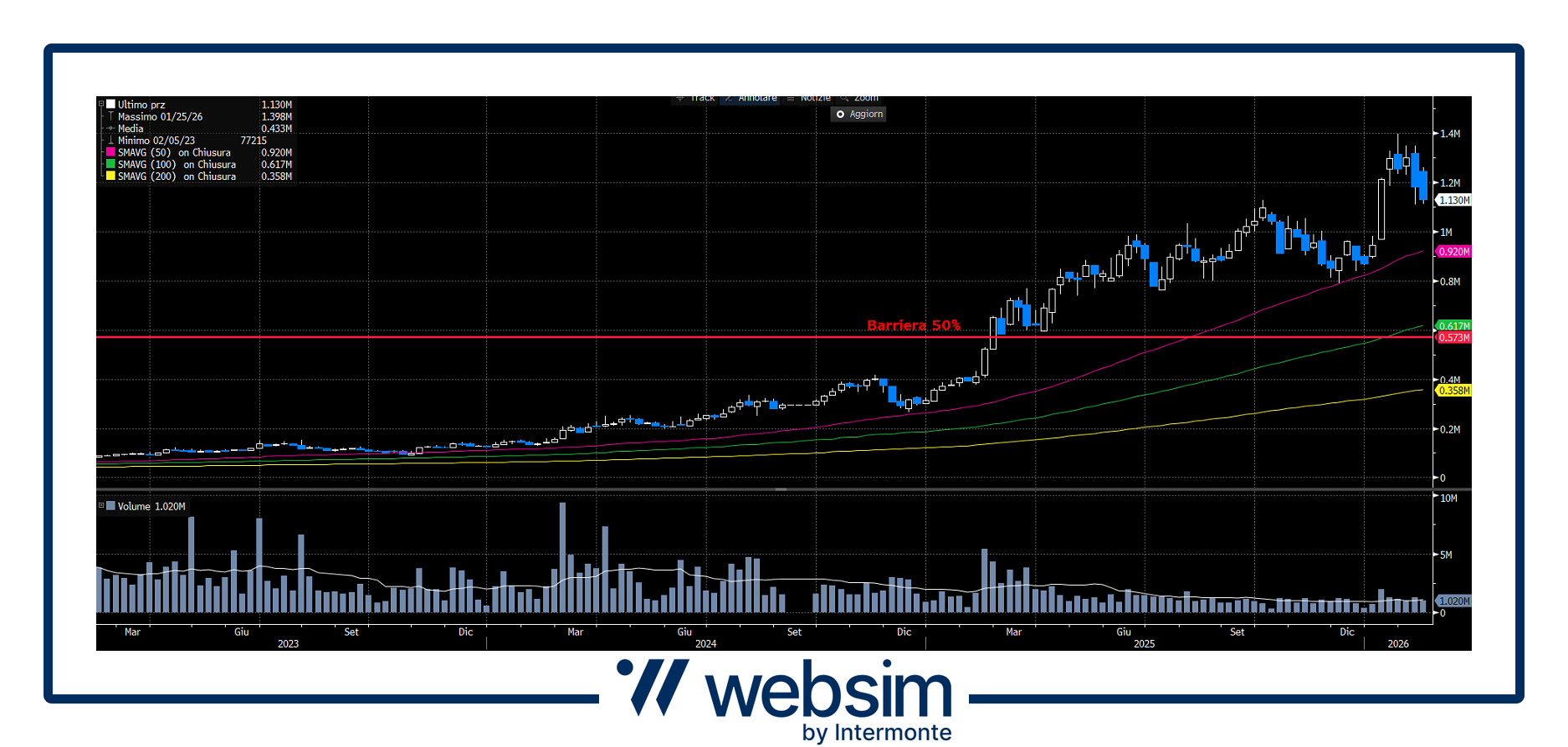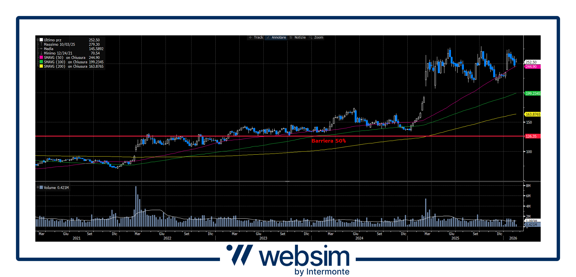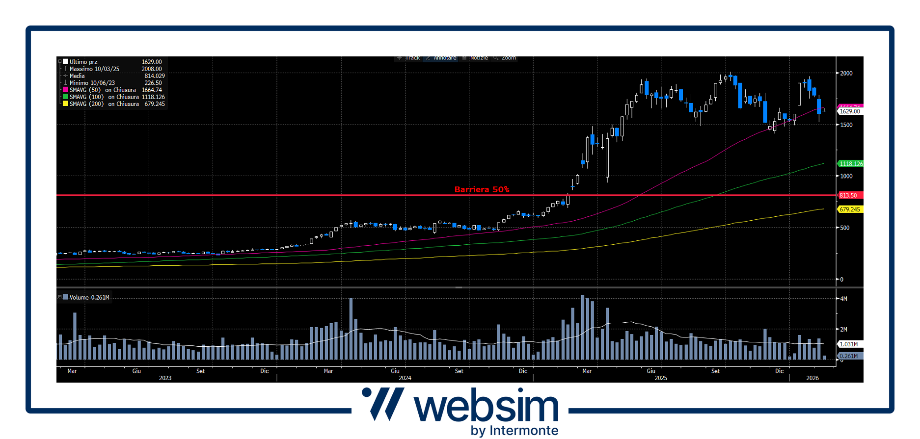 Il titolo conferma un trend rialzista di lungo periodo, con quotazioni ben sopra le medie mobili a 50, 100 e 200, segnale di forza strutturale. La barriera al 50% risulta molto lontana dai prezzi correnti e coincide con un’area di supporto di lungo termine, offrendo un ampio margine di sicurezza anche in scenari correttivi.