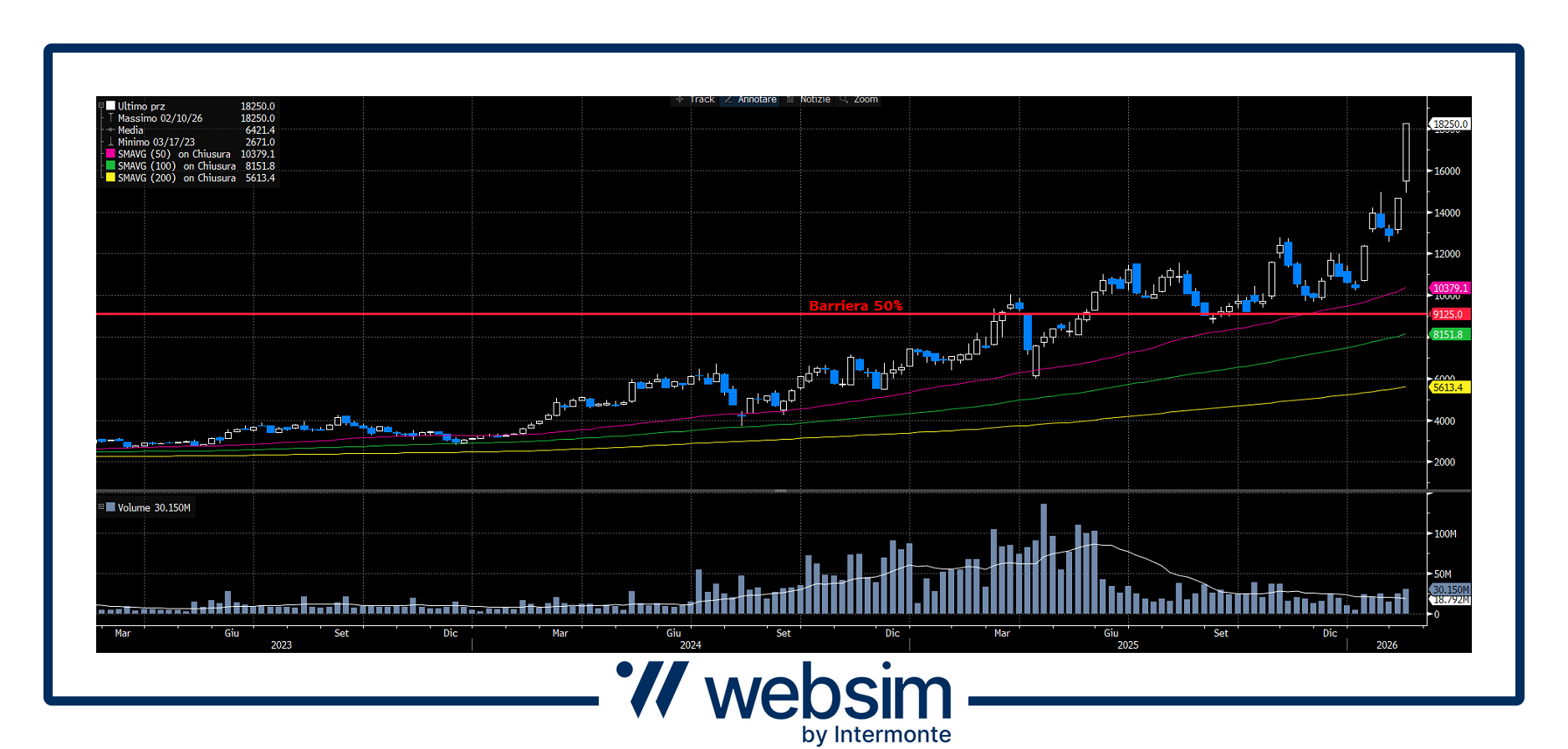 Il grafico mostra un trend rialzista solido, con prezzi stabilmente sopra le medie mobili principali. La barriera al 50% resta ben distante dai livelli attuali e coincide con un’area di supporto già testata, riducendo il rischio di downside nel medio periodo.