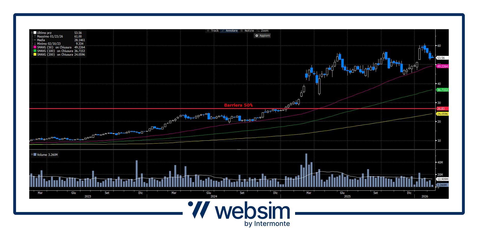 Dal grafico, il titolo mostra un trend strutturalmente rialzista, con prezzi sopra le medie mobili, a conferma di una dinamica tecnica solida. La barriera al 50% è ampiamente distante e coincide con un’area già superata, offrendo un buon margine di protezione nel medio periodo.