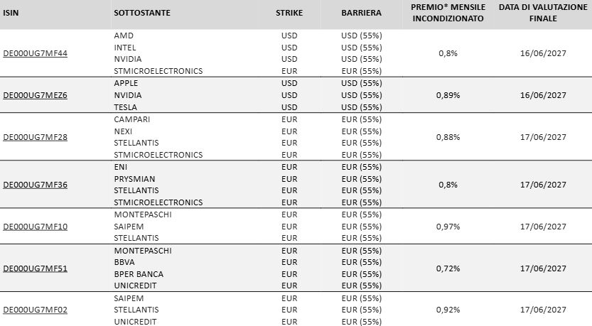 Tra i nuovi panieri proposti da UniCredit troviamo ad esempio il certificato ISIN DE000UG7MF51, strumento che permette di puntare sul comparto bancario beneficiando però di una solida protezione del capitale a scadenza visto il posizionamento delle barriere al 55%. I titoli sottostanti al basket worst of sono Banca MPS, Bper Banca, UniCredit e BBVA. Il prodotto offre premi fissi mensili dello 0,72%, arrivando così a pagare un ottimo 8,64% annuo incondizionato. Un grosso vantaggio per l'investitore visto che ancor prima di entrare in posizione sa già di incassare il 17,28% nei due anni di vita a prescindere dall'andamento dei titoli sottostanti.